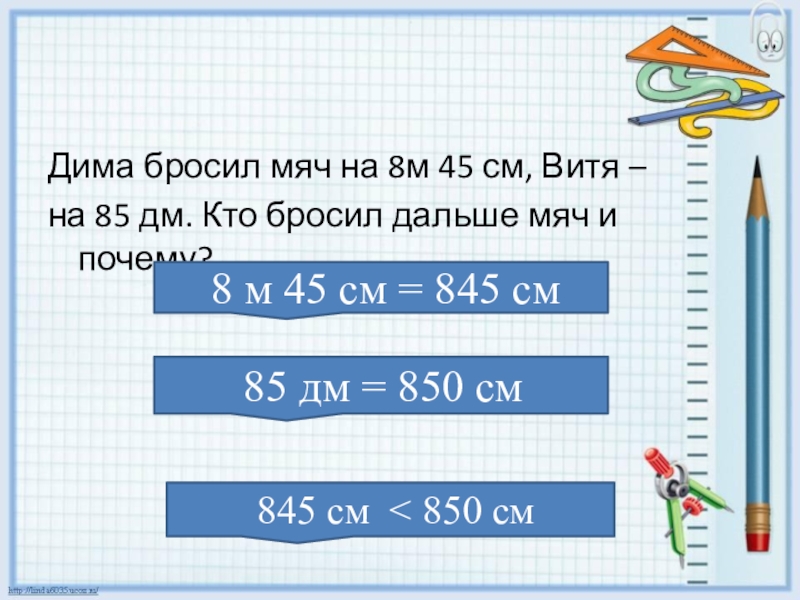 Дима бросил мяч на 8м 45 см, Витя –на 85 дм. Кто бросил дальше мяч и почему?