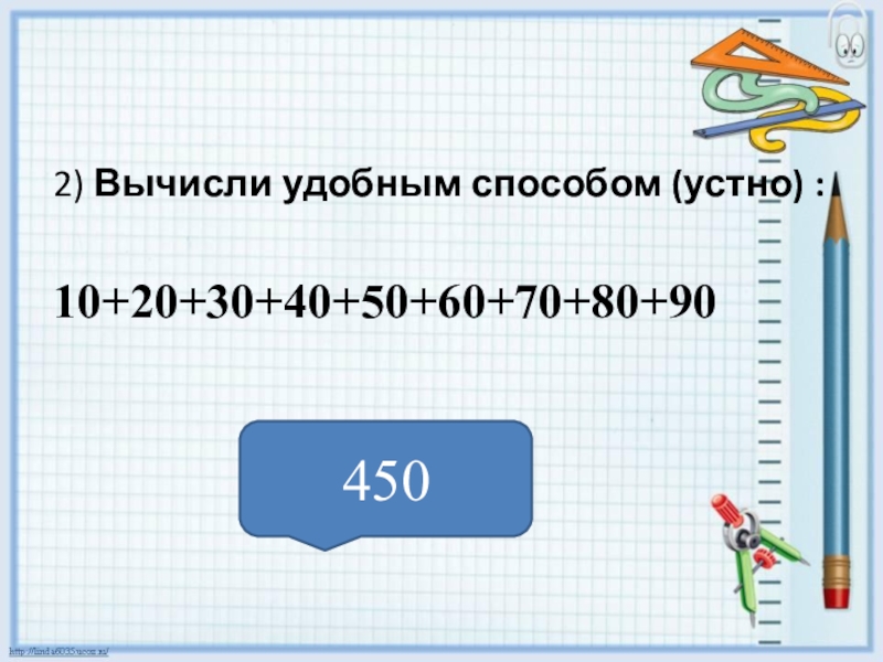 2) Вычисли удобным способом (устно) :10+20+30+40+50+60+70+80+90450