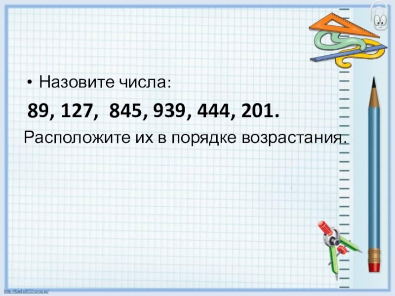 Назовите числа: 89, 127, 845, 939, 444, 201.Расположите их в порядке возрастания.