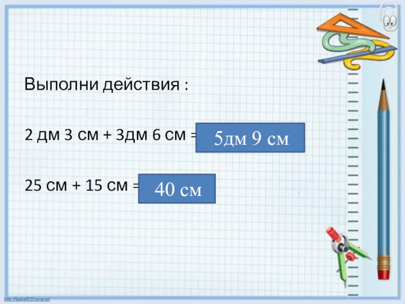 Выполни действия : 2 дм 3 см + 3дм 6 см =25 см + 15 см =