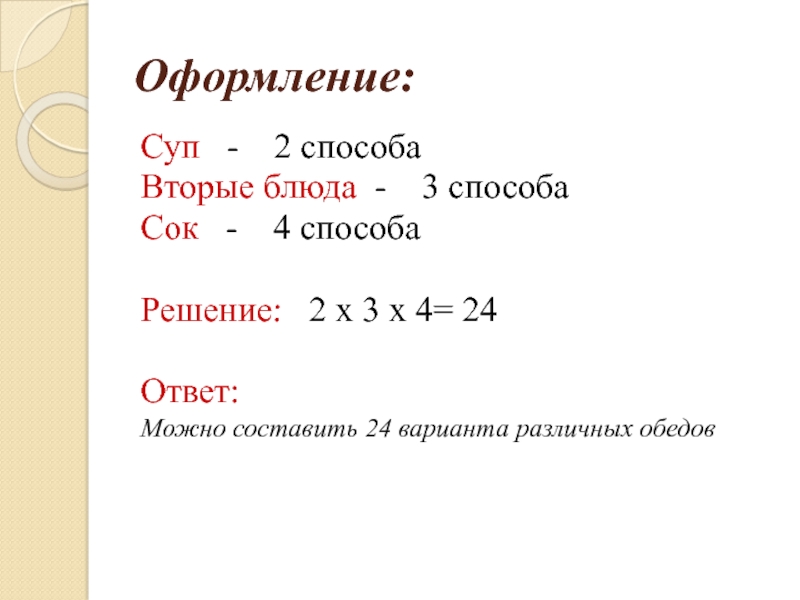 На обед в школьной столовой предлагается 2 вида супа, 3 вторых блюда и 4 разных сока. Сколько различных обедов можно составить по предложенному меню?