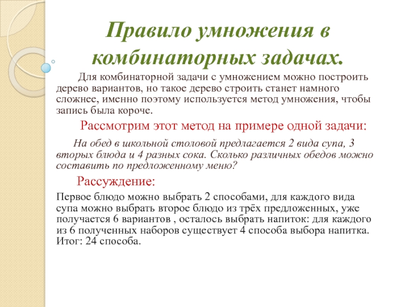 к решению самых разных комбинаторных задач с помощью составления специальных схем. Внешне такая схема напоминает дерево, отсюда название - дерево возможных вариантов. При правильном построении дерева ни один из возможных вариантов решения не будет потерян.