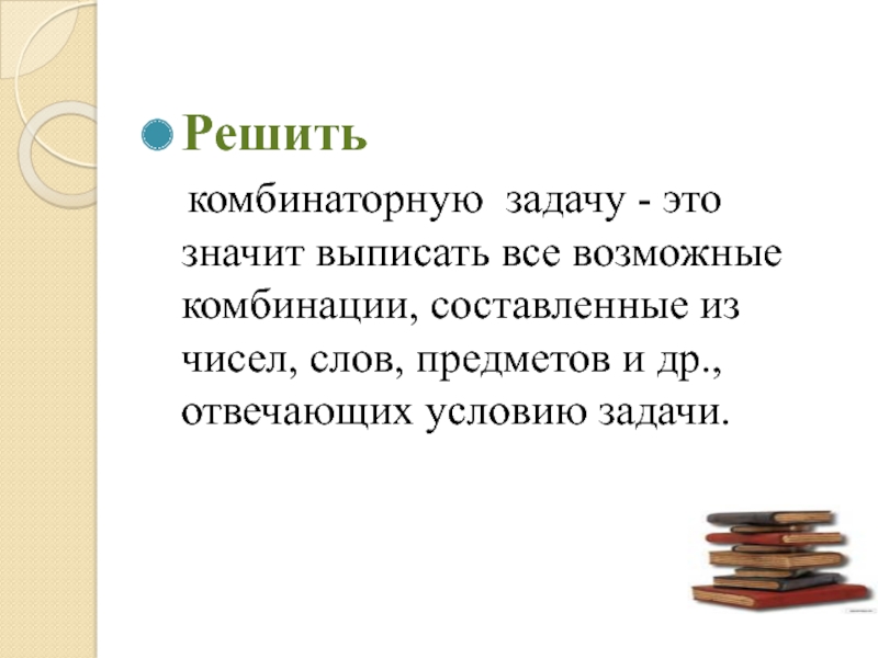 комбинации, составленные из чисел, слов, предметов и др., отвечающих условию задачи.