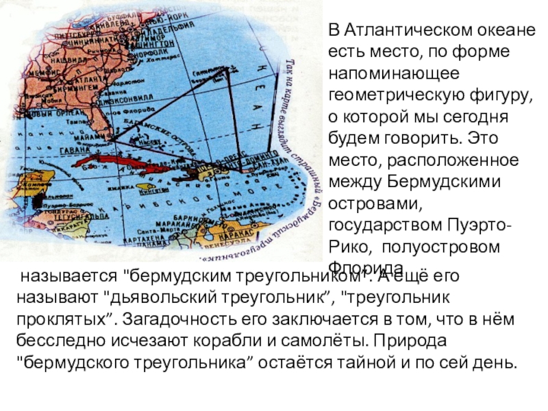 называется "бермудским треугольником”. А ещё его называют "дьявольский треугольник”, "треугольник проклятых”. Загадочность его заключается в том, что в нём бесследно исчезают корабли и самолёты. Природа "бермудского треугольника” остаётся тайной и по сей день.