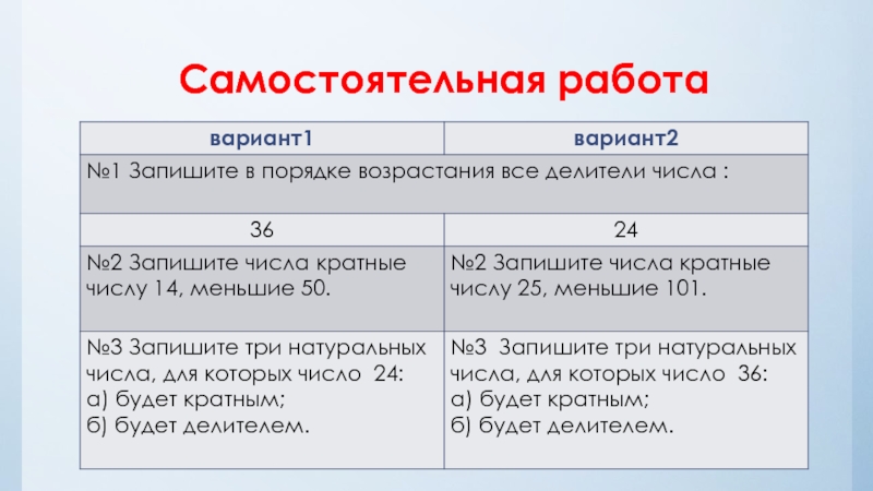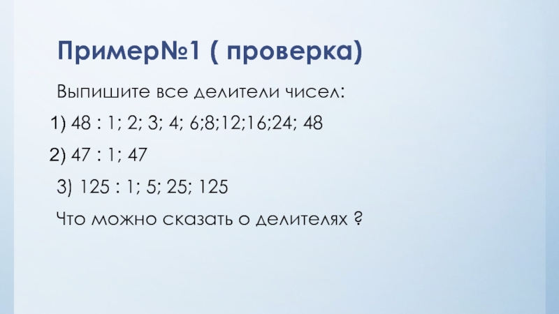 Пример№1 ( проверка)Выпишите все делители чисел:48 : 1; 2; 3; 4; 6;8;12;16;24; 48 47 : 1; 473)