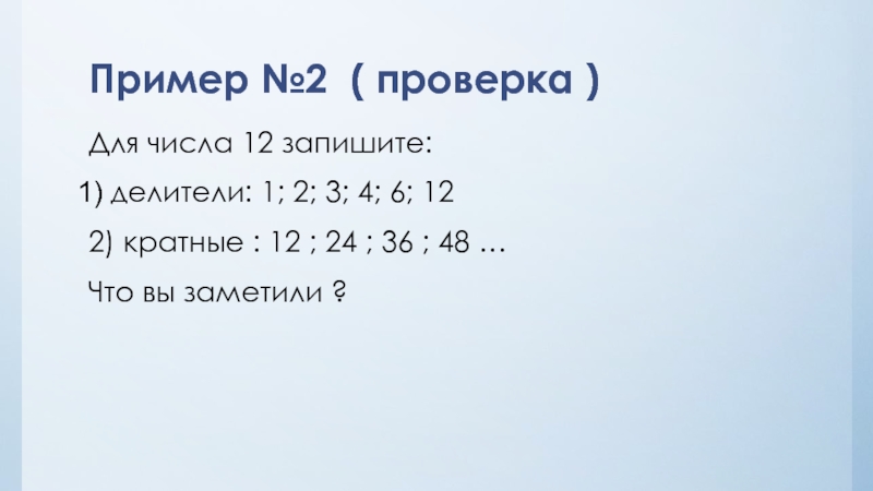Пример №2 ( проверка )Для числа 12 запишите:делители: 1; 2; 3; 4; 6; 12 2) кратные :