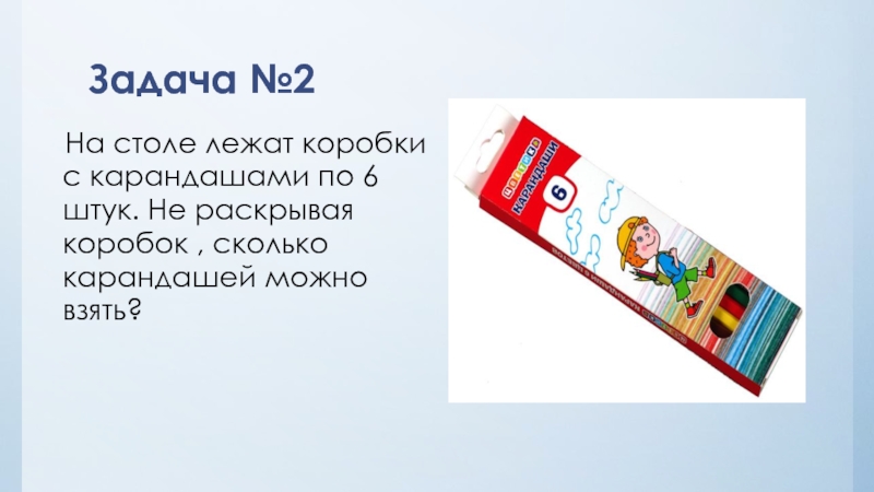 Задача №2  На столе лежат коробки с карандашами по 6 штук. Не раскрывая коробок , сколько