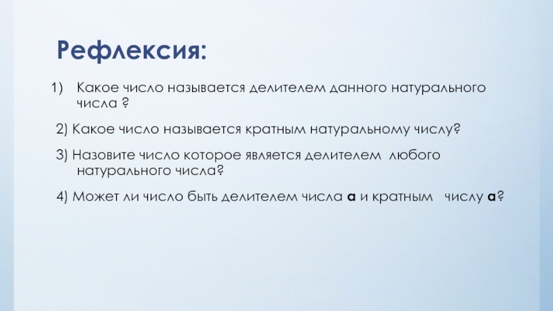 Рефлексия:Какое число называется делителем данного натурального числа ?2) Какое число называется кратным натуральному числу?3) Назовите число которое