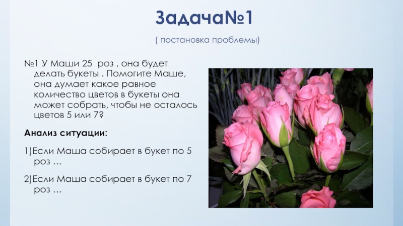 Задача№1  ( постановка проблемы)№1 У Маши 25 роз , она будет делать букеты . Помогите Маше,
