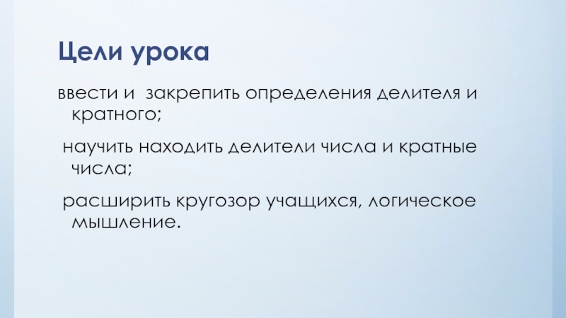 Цели урокаввести и закрепить определения делителя и кратного; научить находить делители числа и кратные числа; расширить кругозор учащихся, логическое мышление.