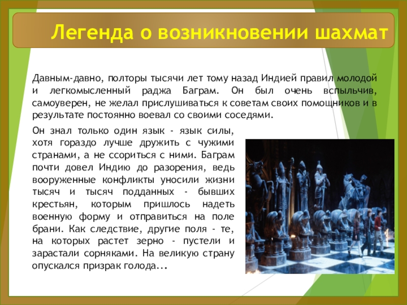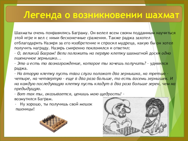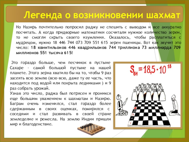 Узнав это число, раджа был потрясен и проникся еще большим уважением к шахматам и Назирю. Баграм очень изменился, стал гораздо более сдержанным в своих оценках, помирился с соседями и стал развивать в своей стране земледелие и ремесла. На землю Индии пришли мир и благоденствие.
