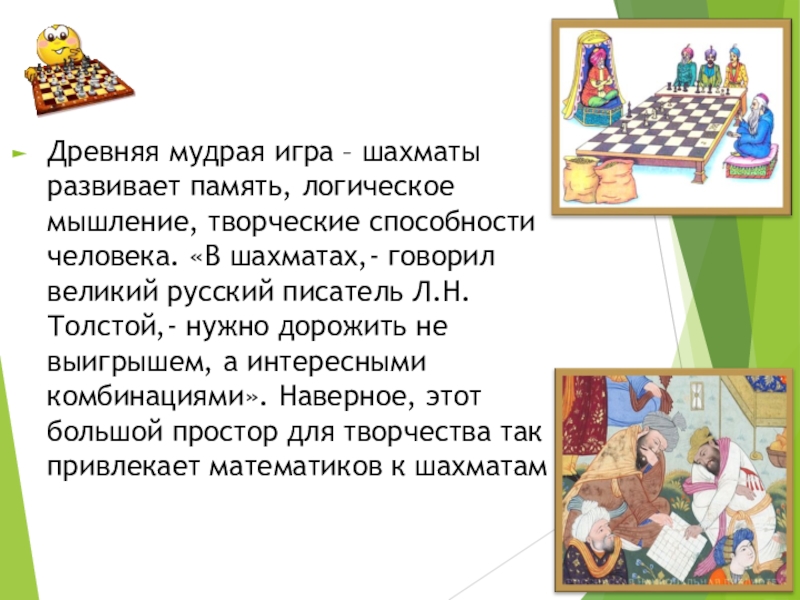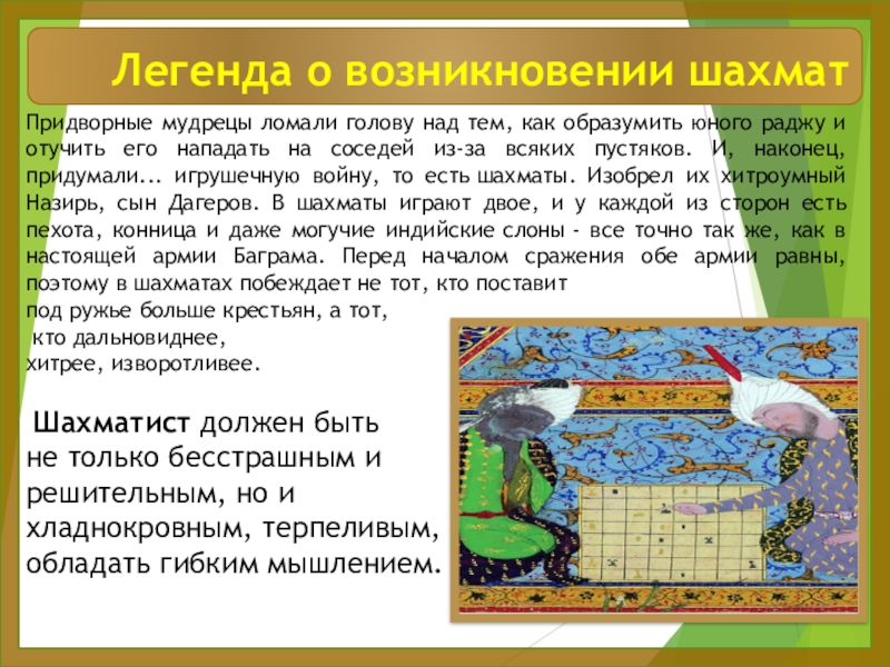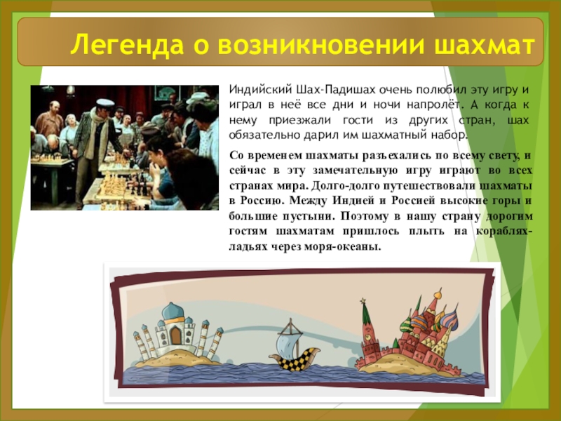 Индийский Шах-Падишах очень полюбил эту игру и играл в неё все дни и ночи напролёт. А когда к нему приезжали гости из других стран, шах обязательно дарил им шахматный набор.