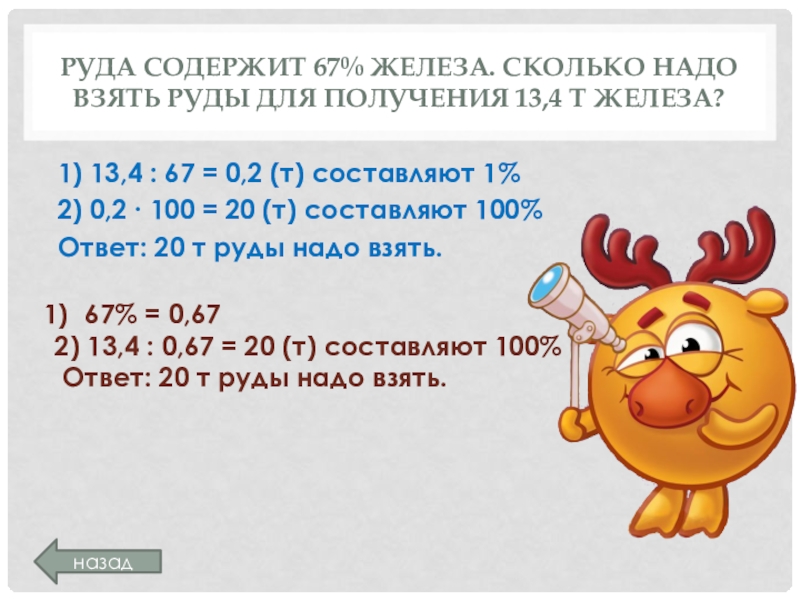 2) 13,4 : 0,67 = 20 (т) составляют 100%