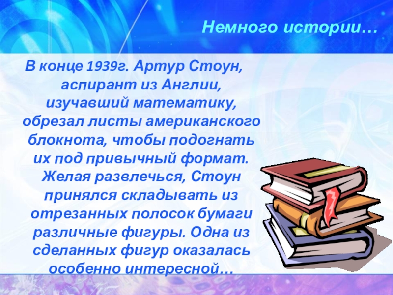 Немного истории…В конце 1939г. Артур Стоун, аспирант из Англии, изучавший математику, обрезал листы американского блокнота, чтобы подогнать их под привычный формат. Желая развлечься, Стоун принялся складывать из отрезанных полосок бумаги различные фигуры. Одна из сделанных фигур