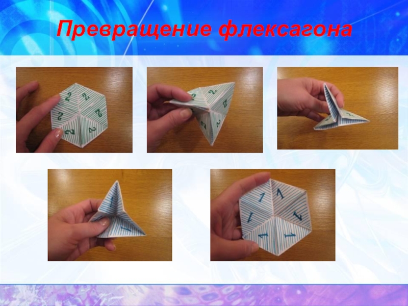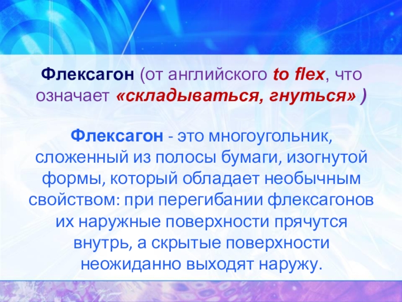 это многоугольник, сложенный из полосы бумаги, изогнутой формы, который обладает необычным свойством: при перегибании флексагонов их наружные поверхности прячутся внутрь, а скрытые поверхности неожиданно выходят наружу.