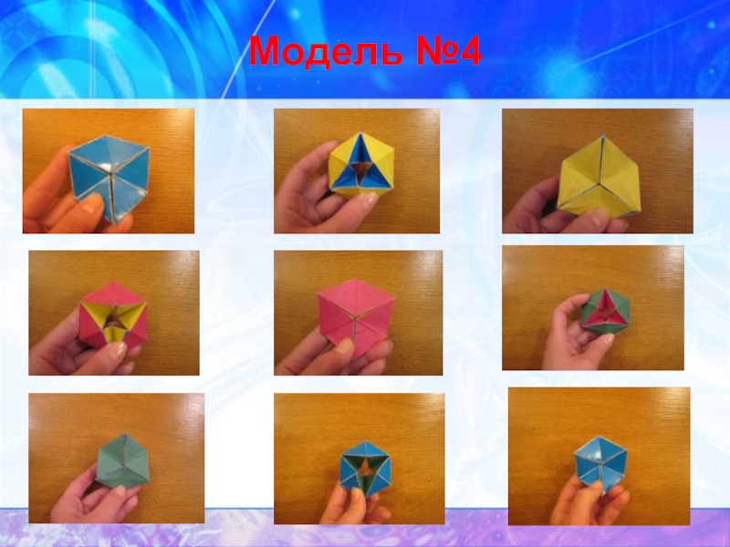 технике. Но даже такие объекты как флексагоны, причем всех разновидностей нашли свое применение в некоторых художественных областях. Флексагоны выступают в роли игрушек и головоломок. Действительно, бывает иногда занимательно складывать флексагоны, выворачивать их, наблюдать, как они меняют форму и поворачиваются к нам разными комбинациями сторон. Флексагоны применяются при сборке игрушек (тетрафлексагоны), используются как открытки на различные темы.