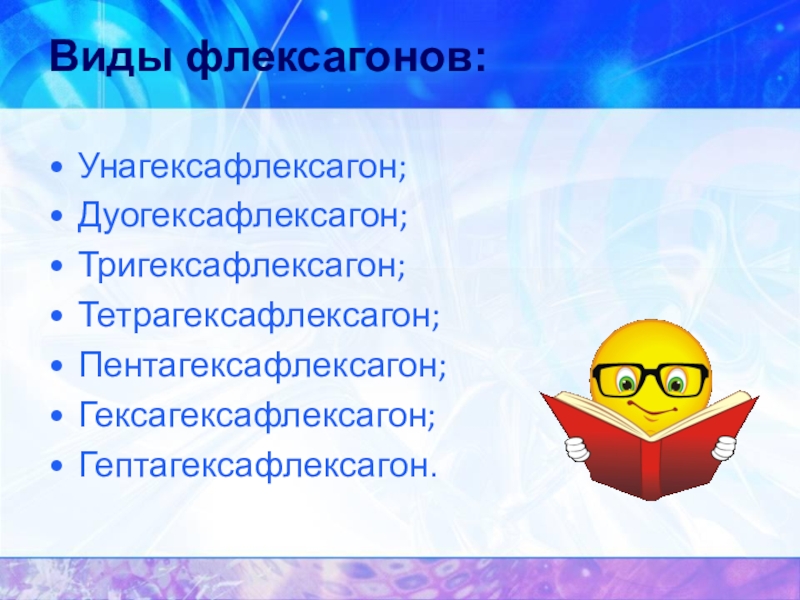 Виды флексагонов:Унагексафлексагон;Дуогексафлексагон;Тригексафлексагон;Тетрагексафлексагон;Пентагексафлексагон;Гексагексафлексагон;Гептагексафлексагон.