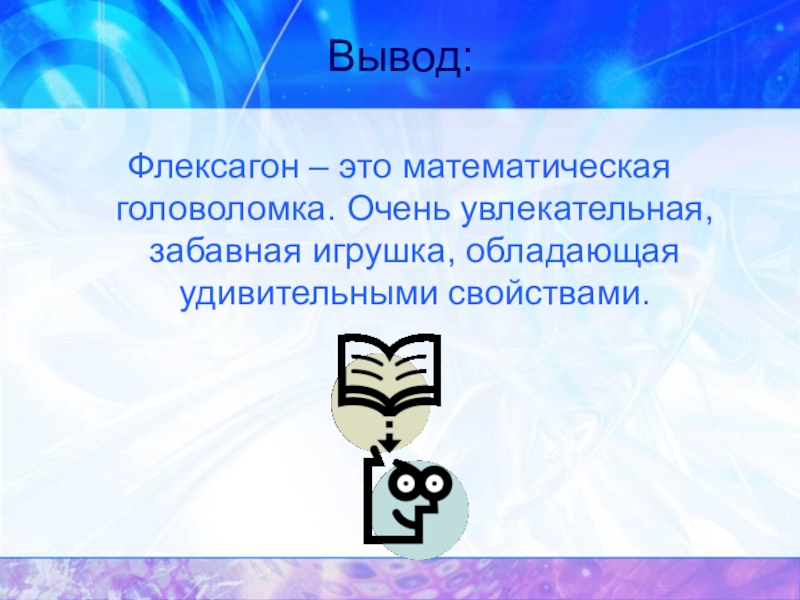 Вывод:Флексагон – это математическая головоломка. Очень увлекательная, забавная игрушка, обладающая удивительными свойствами.