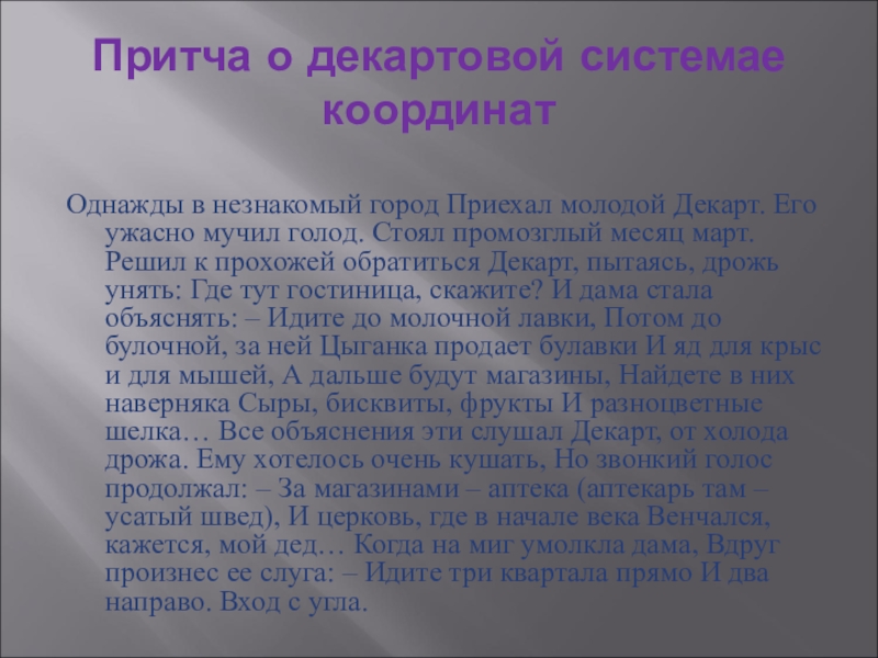 Его ужасно мучил голод. Стоял промозглый месяц март. Решил к прохожей обратиться Декарт, пытаясь, дрожь унять: Где тут гостиница, скажите? И дама стала объяснять: – Идите до молочной лавки, Потом до булочной, за ней Цыганка продает булавки И яд для крыс и для мышей, А дальше будут магазины, Найдете в них наверняка Сыры, бисквиты, фрукты И разноцветные шелка… Все объяснения эти слушал Декарт, от холода дрожа. Ему хотелось очень кушать, Но звонкий голос продолжал: – За магазинами – аптека (аптекарь там – усатый швед), И церковь, где в начале века Венчался, кажется, мой дед… Когда на миг умолкла дама, Вдруг произнес ее слуга: – Идите три квартала прямо И два направо. Вход с угла.