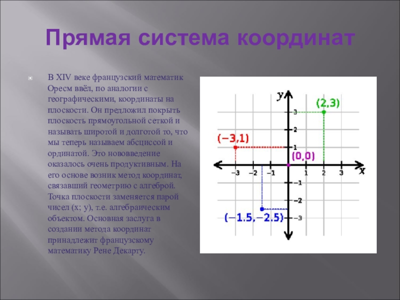 с географическими, координаты на плоскости. Он предложил покрыть плоскость прямоугольной сеткой и называть широтой и долготой то, что мы теперь называем абсциссой и ординатой. Это нововведение оказалось очень продуктивным. На его основе возник метод координат, связавший геометрию с алгеброй. Точка плоскости заменяется парой чисел (х; у), т.е. алгебраическим объектом. Основная заслуга в создании метода координат принадлежит французскому математику Рене Декарту.