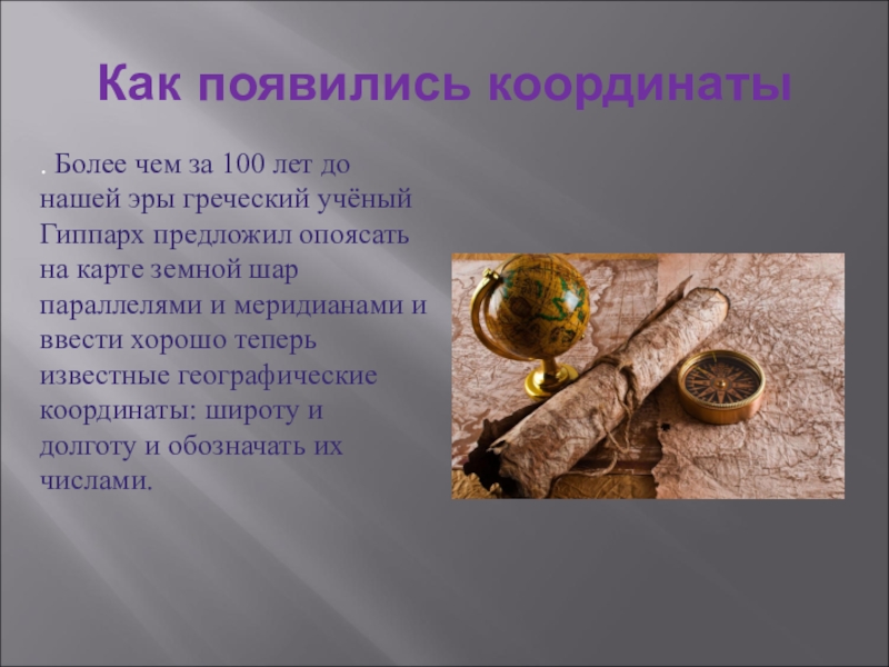 первоначально идея метода координат возникла ещё в древнем мире в связи с потребностями астрономии, географии, живописи. Древнегреческого ученого Анаксимандра Милетского (ок. 610-546 до н. э.) считаю составителем п ервой географической карты. Он четко описывал широту и долготу места, используя прямоугольные проекции. Уже во II веке греческий астроном Клавдий Птолемей пользовался широтой и долготой в качестве координат. Прямоугольной сеткой пользовались также художники эпохи Возрождения.