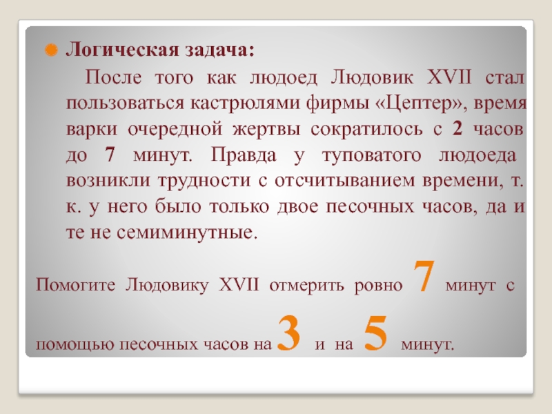 После того как людоед Людовик XVII стал пользоваться кастрюлями фирмы «Цептер», время варки очередной жертвы сократилось с 2 часов до 7 минут. Правда у туповатого людоеда возникли трудности с отсчитыванием времени, т.к. у него было только двое песочных часов, да и те не семиминутные.