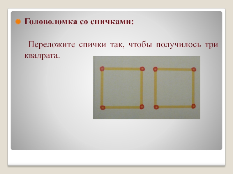 Головоломка со спичками:    Переложите спички так, чтобы получилось три квадрата.