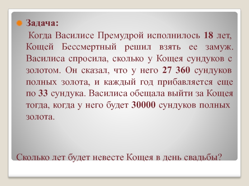 Премудрой исполнилось 18 лет, Кощей Бессмертный решил взять ее замуж. Василиса спросила, сколько у Кощея сундуков с золотом. Он сказал, что у него 27 360 сундуков полных золота, и каждый год прибавляется еще по 33 сундука. Василиса обещала выйти за Кощея тогда, когда у него будет 30000 сундуков полных золота.