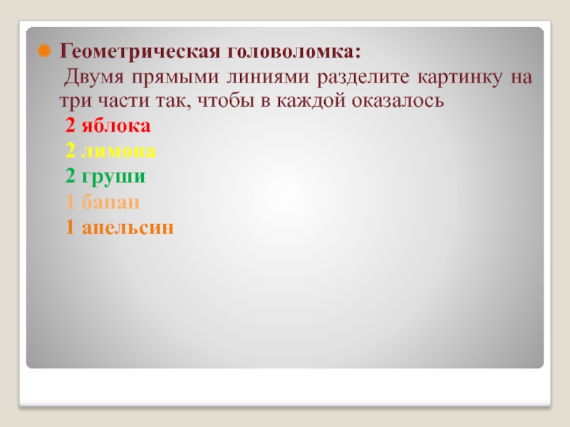 Геометрическая головоломка:  Двумя прямыми линиями разделите картинку на три части так, чтобы в каждой оказалось