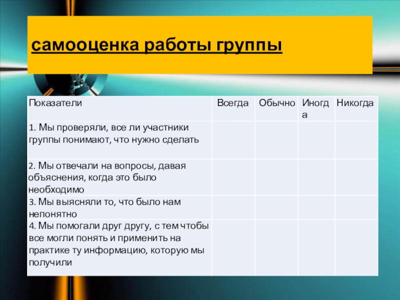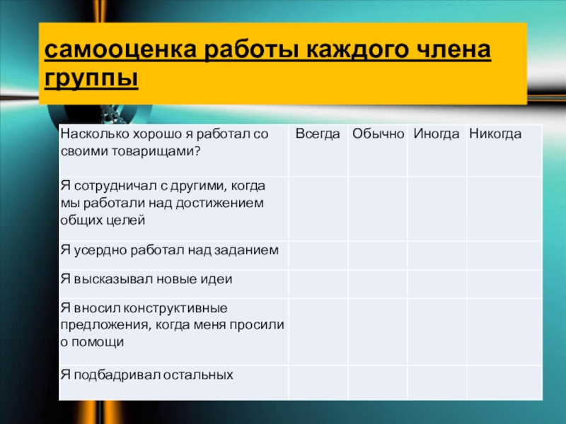 Слайд 11самооценка работы каждого члена группы