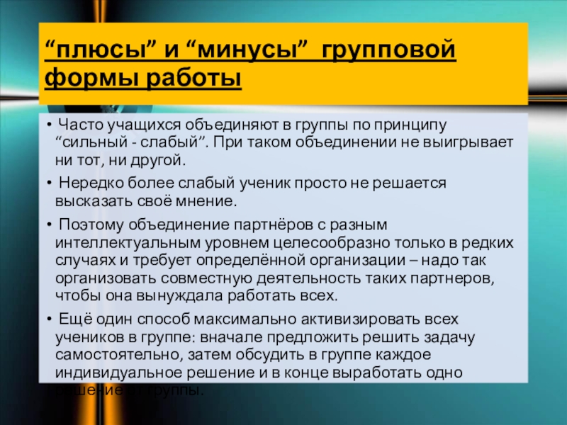 Слайд 4“плюсы” и “минусы” групповой формы работы