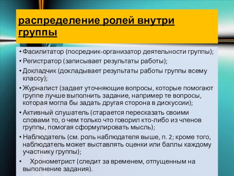 Слайд 8распределение ролей внутри группы