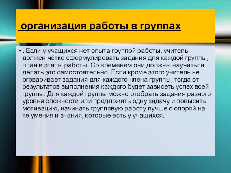работы, учитель должен чётко сформулировать задания для каждой группы, план и этапы работы. Со временем они должны научиться делать это самостоятельно. Если кроме этого учитель не оговаривает задания для каждого члена группы, тогда от результатов выполнения каждого будет зависеть успех всей группы. Для каждой группы можно отобрать задания разного уровня сложности или предложить одну задачу и повысить мотивацию, начинать групповую работу лучше с опорой на те умения и знания, которые есть у учащихся.