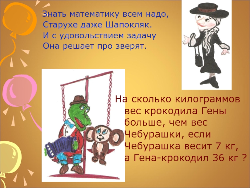 На сколько килограммов вес крокодила Гены больше, чем вес Чебурашки, если Чебурашка весит 7 кг, а Гена-крокодил 36 кг ?