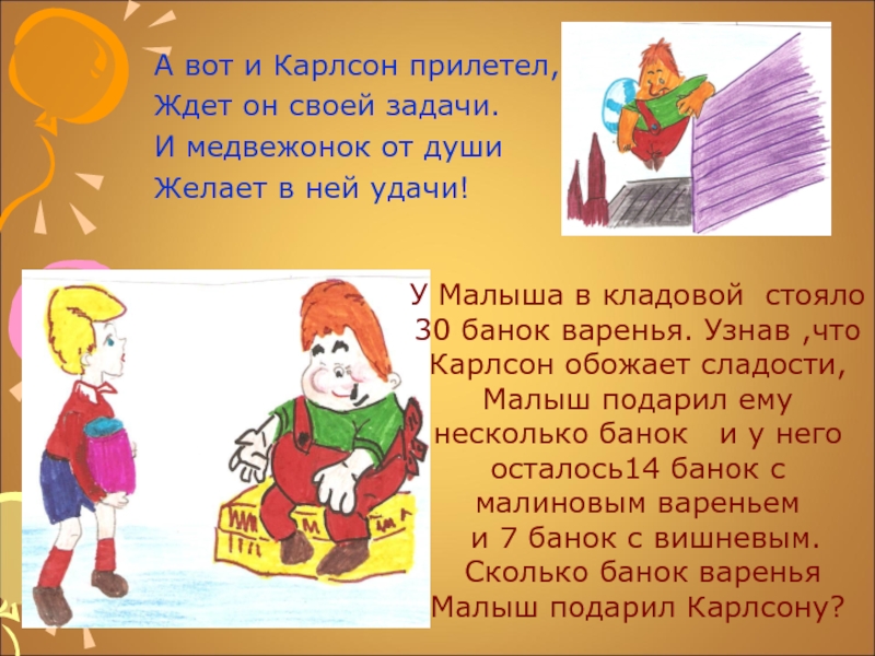 У Малыша в кладовой стояло 30 банок варенья. Узнав ,что Карлсон обожает сладости, Малыш подарил ему несколько банок и у него осталось14 банок с малиновым вареньем
