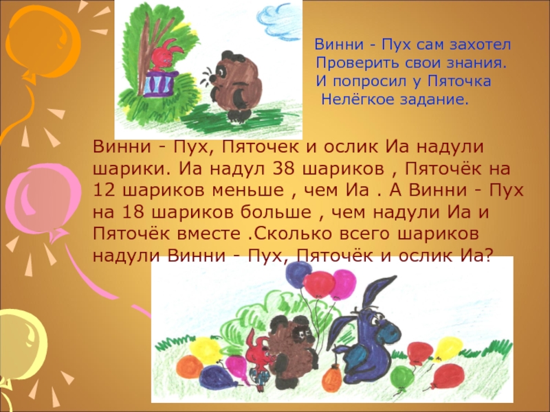Винни - Пух, Пяточек и ослик Иа надули шарики. Иа надул 38 шариков , Пяточёк на 12 шариков меньше , чем Иа . А Винни - Пух на 18 шариков больше , чем надули Иа и Пяточёк вместе .Сколько всего шариков надули Винни - Пух, Пяточёк и ослик Иа?