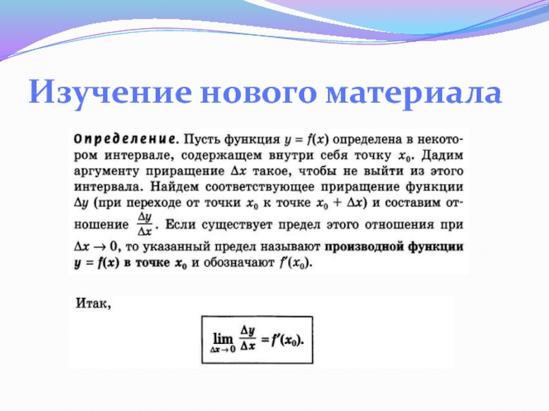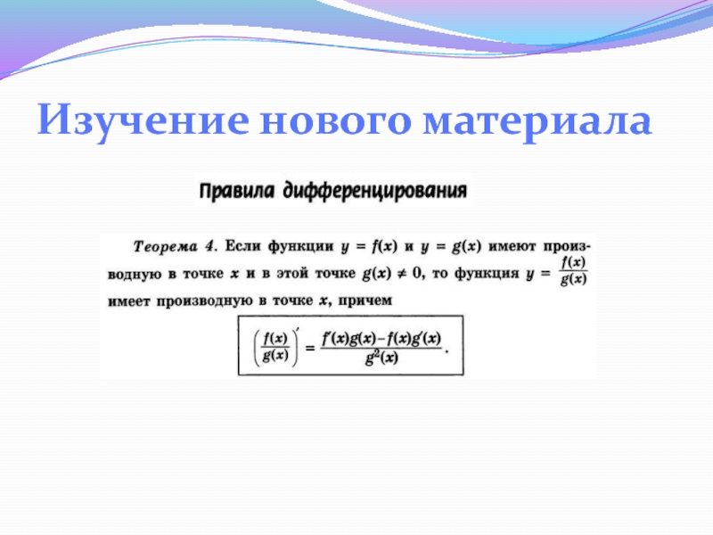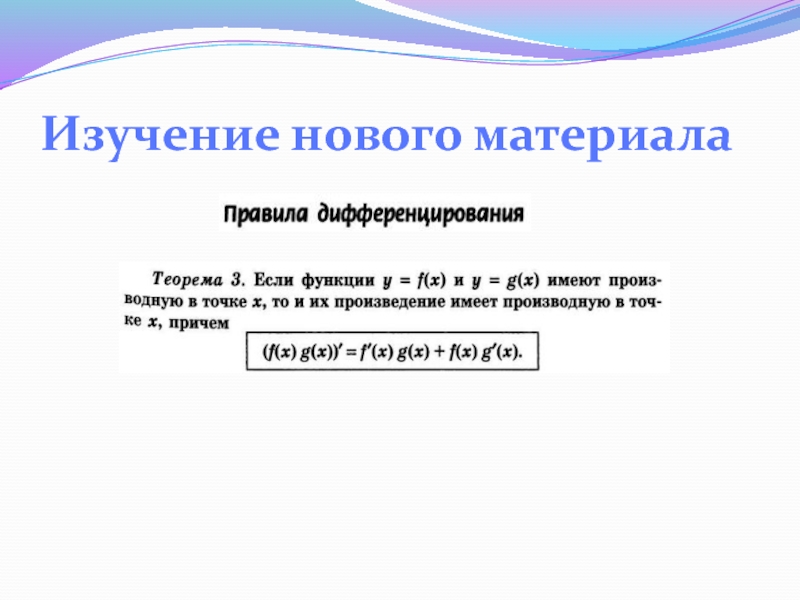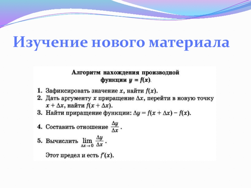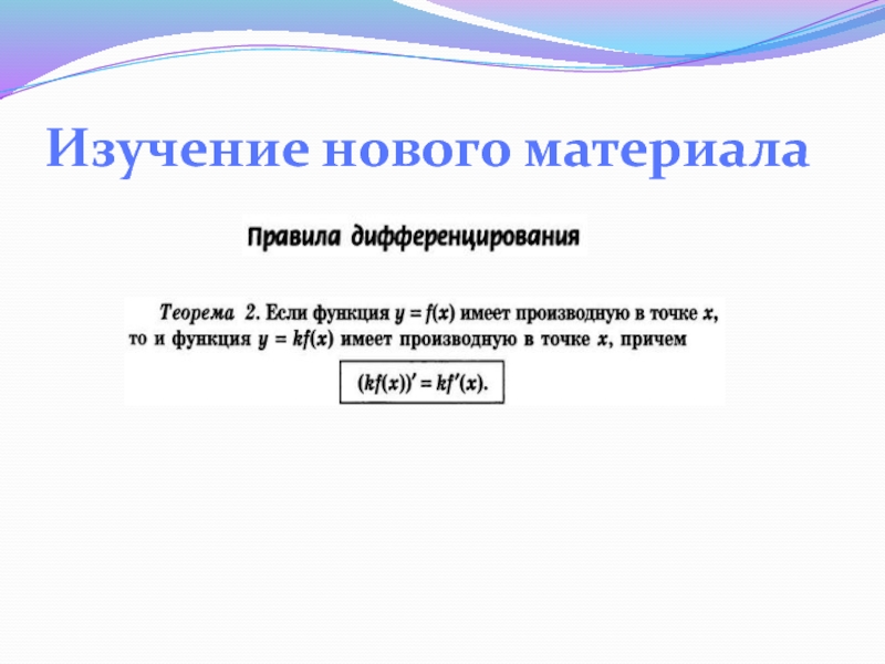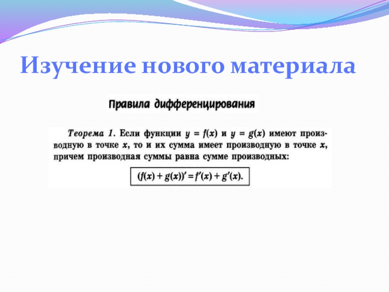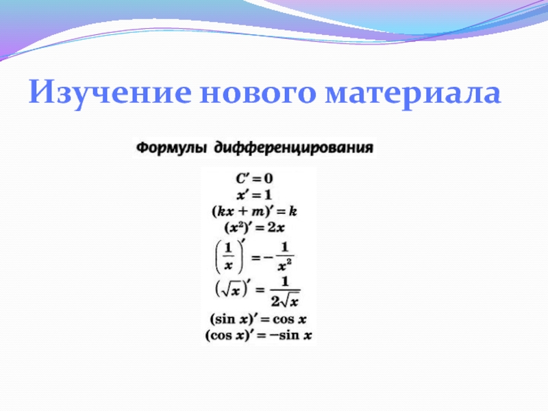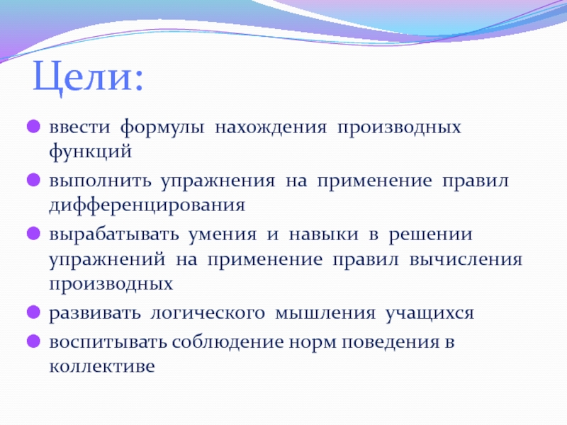 Цели: ввести формулы нахождения производных функцийвыполнить упражнения на применение правил дифференцированиявырабатывать умения и навыки в решении упражнений на применение правил вычисления производныхразвивать логического мышления учащихсявоспитывать соблюдение норм поведения в коллективе