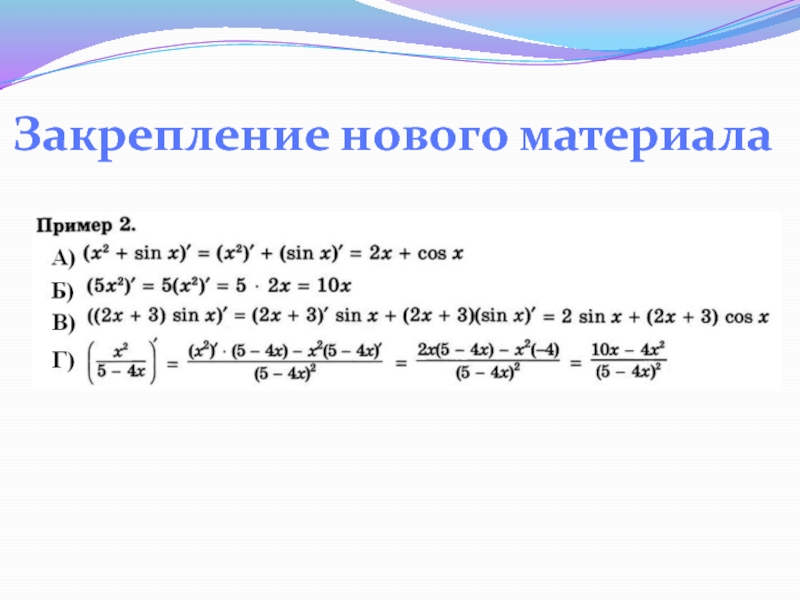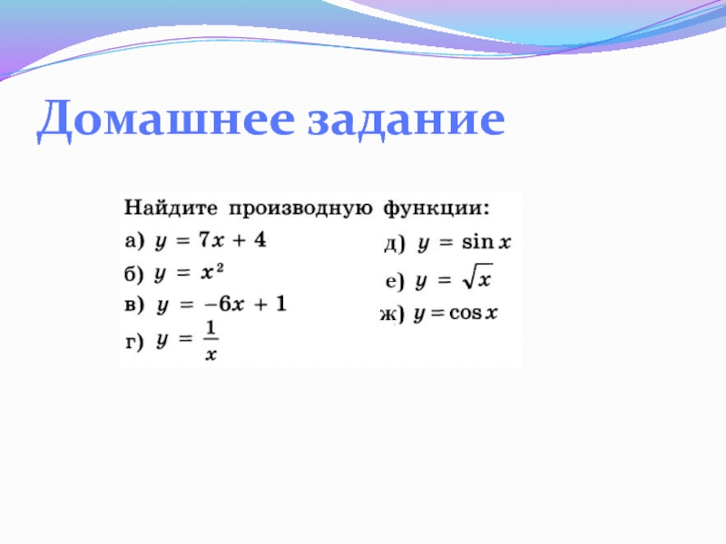Цели: ввести формулы нахождения производных функцийвыполнить упражнения на применение правил дифференцированиявырабатывать умения и навыки в решении упражнений