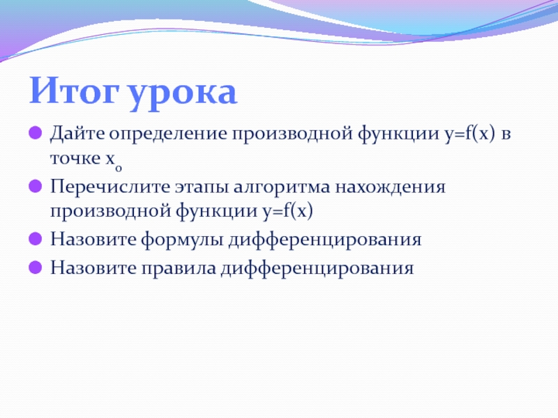 Итог урокаДайте определение производной функции y=f(x) в точке x0Перечислите этапы алгоритма нахождения производной функции y=f(x)Назовите формулы дифференцированияНазовите