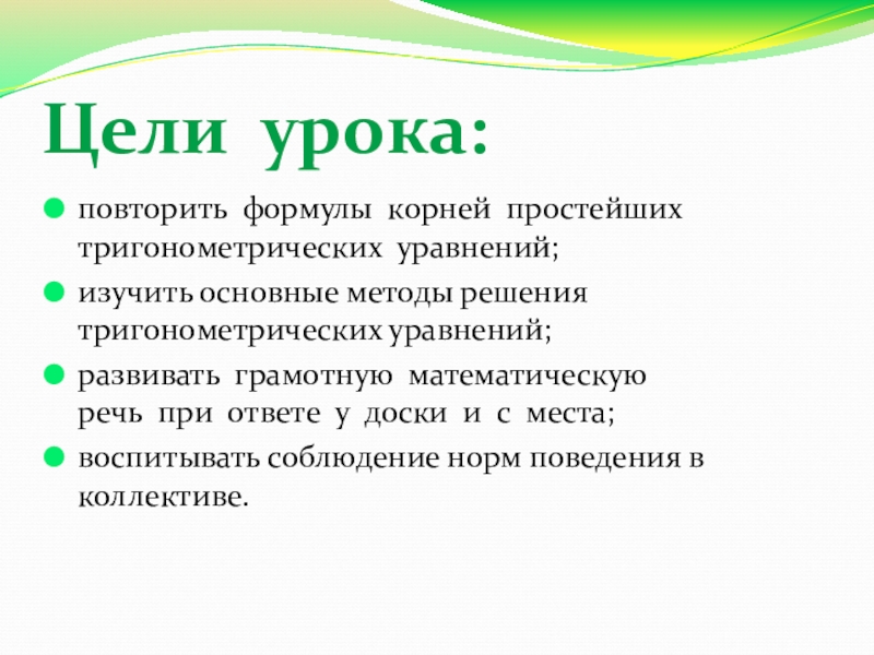 Цели урока: повторить формулы корней простейших тригонометрических уравнений;изучить основные методы решения тригонометрических уравнений;развивать грамотную математическую речь при ответе у доски и с места;воспитывать соблюдение норм поведения в коллективе.