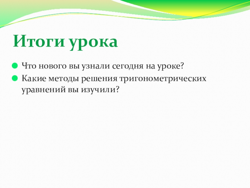 Итоги урока Что нового вы узнали сегодня на уроке?Какие методы решения тригонометрических уравнений вы изучили?