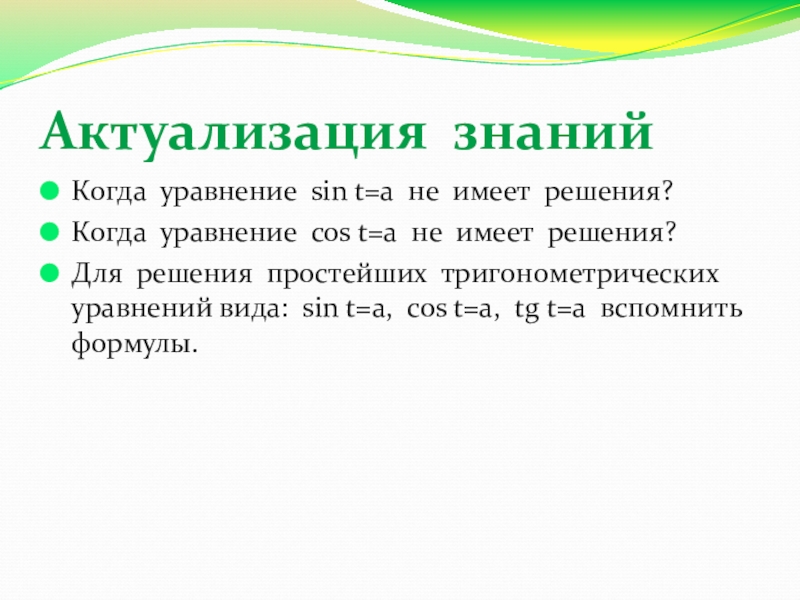 Актуализация знаний Когда уравнение sin t=a не имеет решения?Когда уравнение cos t=a не имеет решения?Для решения простейших