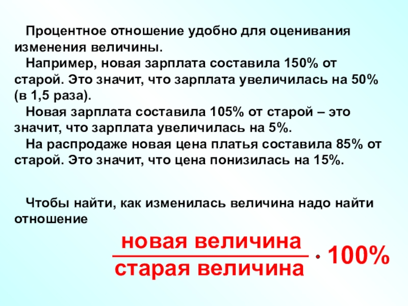 Например, новая зарплата составила 150% от старой. Это значит, что зарплата увеличилась на 50% (в 1,5 раза).