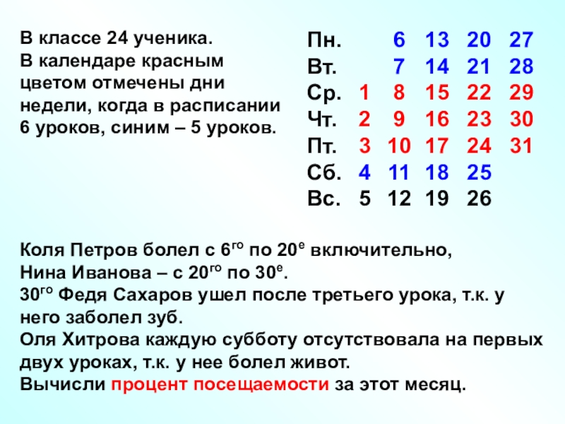 Коля Петров болел с 6го по 20е включительно,