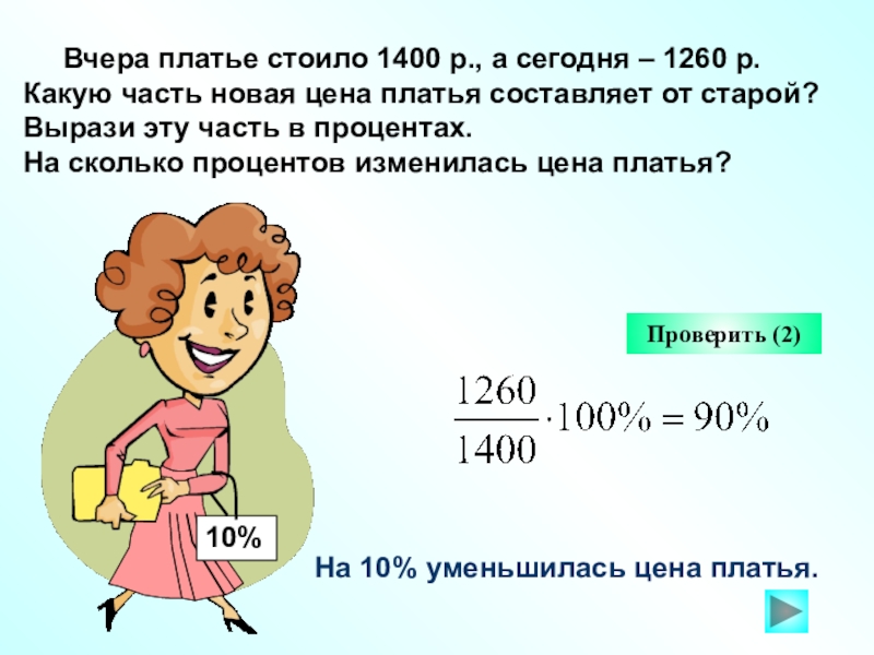 На распродаже новая цена платья составила 85% от старой. Это значит, что цена понизилась на 15%.