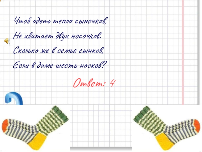 Чтоб одеть тепло сыночков,Не хватает двух носочков. Сколько же в семье сынков,Если в доме шесть носков?