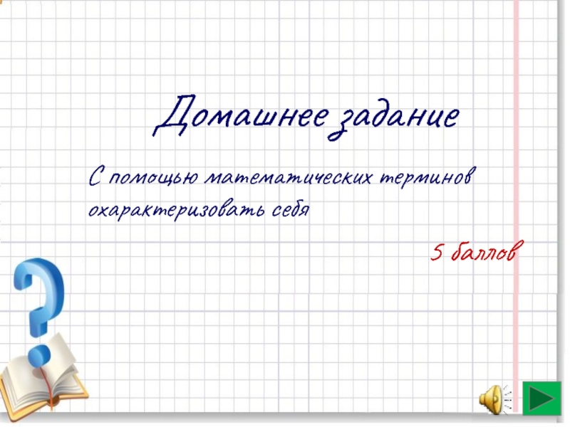 Домашнее заданиеС помощью математических терминов охарактеризовать себя5 баллов