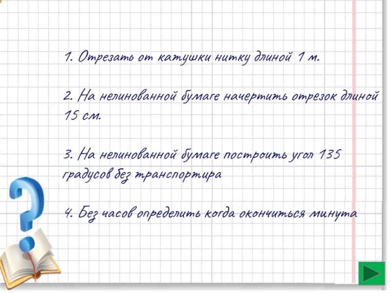 начертить отрезок длиной 15 см. 3. На нелинованной бумаге построить угол 135 градусов без транспортира 4. Без часов определить когда окончиться минута
