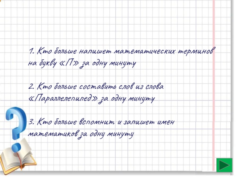 1. Кто больше напишет математических терминов на букву «П» за одну минуту  2. Кто больше составить
