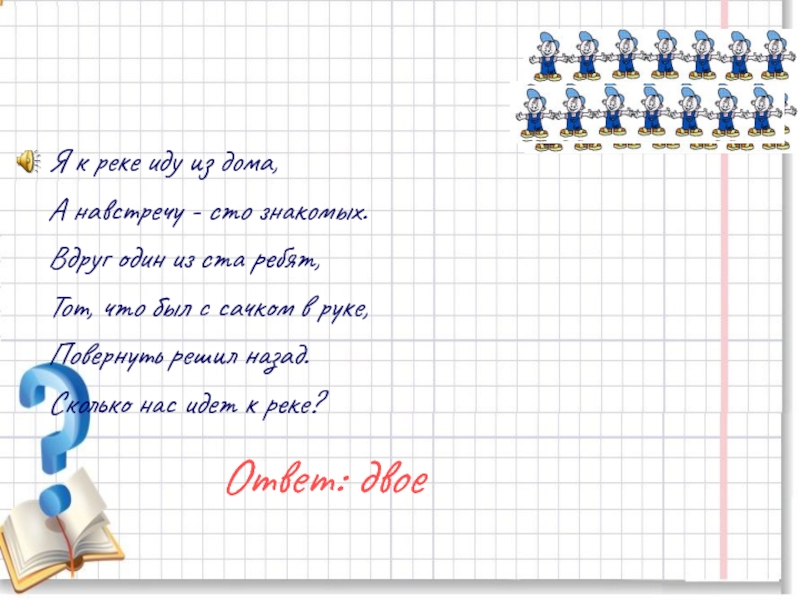 Я к реке иду из дома,А навстречу - сто знакомых.Вдруг один из ста ребят, Тот, что был